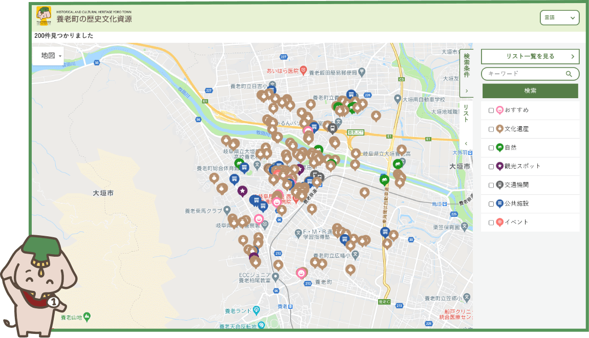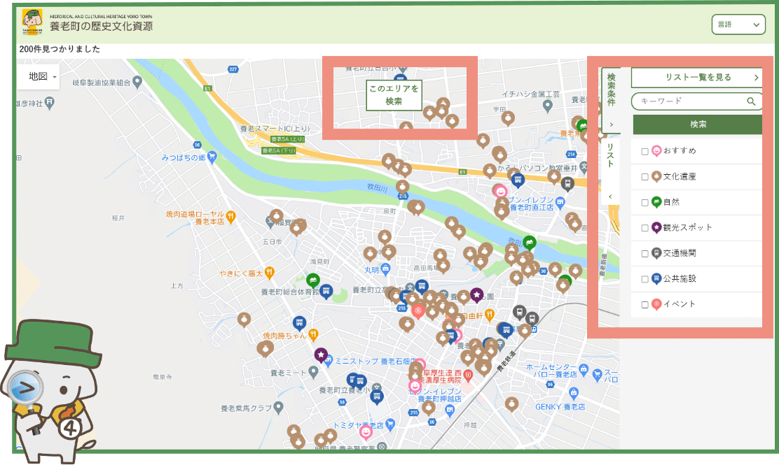 ●養老ガイドを開くと地図上にスポットのアイコンが表示されます。