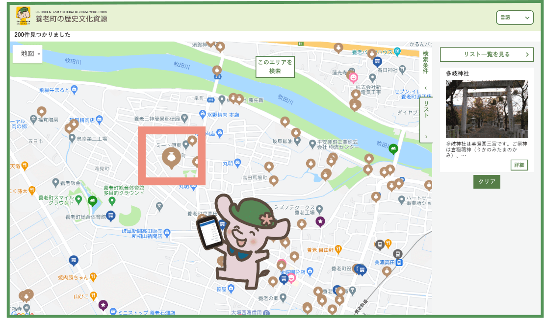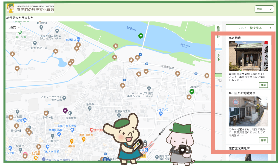 マップ上に表示される、おすすめスポットや文化財スポットから、養老町をより知ることができるコンテンツです。